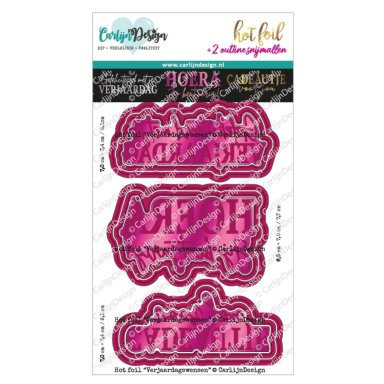 Een set met hot foil mallen en met elk 2 bijpassende outline snijmallen. Na kerst nu een hele toffe set met teksten voor feest en verjaardagen. Hot foil Verjaardagswensen, mallen van goede kwaliteit metaal. Kerst vorig jaar kwam de eerste set met hot foil teksten uit, waar je 3 teksten mee kon foilen en uitsnijden (+ 2 outlines). Daar moesten natuurlijk ook feestelijke varianten van komen, perfect voor op verjaardagskaarten en andere felicitaties! Ook deze set heeft 3 toffe teksten, elk met zelfs 2 outlines om heerlijk te matten. Teksten in deze set: van harte gefeliciteerd, hoera jij bent jarig, cadeautje voor jou. Afmeting: 6,5 en 7,0 cm + outlines.